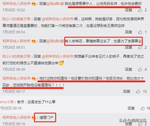 “他打过我你知道吗?他还要打我你知道吗?他目无师长,我比他大十四岁,您说我开除他没有道理吗?!!!”、“清理门户”,面对网友的询问,郑宏伟是这样说的。还表示王声说了,以后还会打自己,见一次打一次,自己才将他逐出师门,另寻名师。