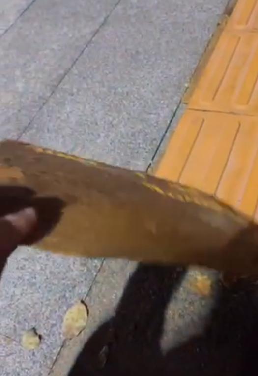 该网友发布的视频显示,道路的地砖上贴有两条黄色的盲道,她蹲下后,随手拿起其中一片,背面的胶水已经干了,地砖上还留有被粘黏过的印记。" 仅有一层皮,像贴纸一样,一撕就掉。"