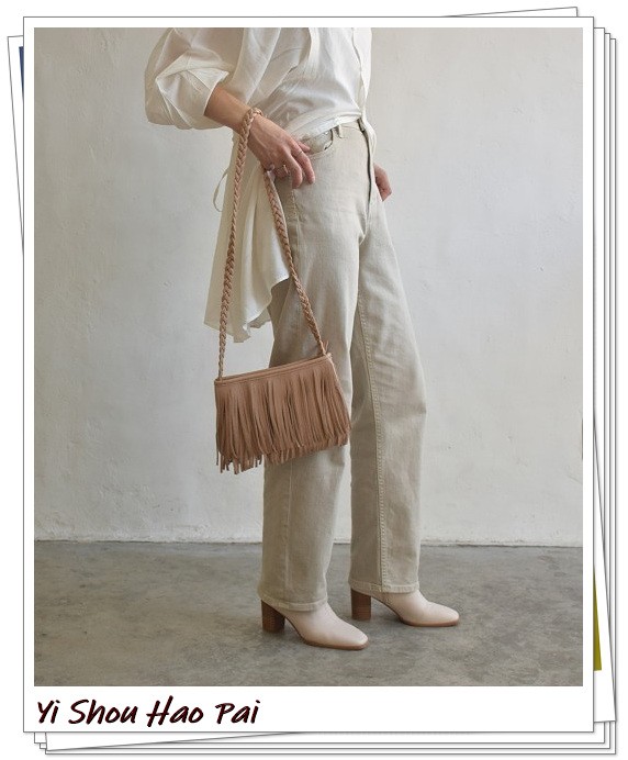 这双短靴采用了时尚的木跟和方头设计,很容易搭配干净的裤装造型。象牙色+木质的自然气息与一身白的穿搭融合得很好。将流苏包作为造型的亮点。