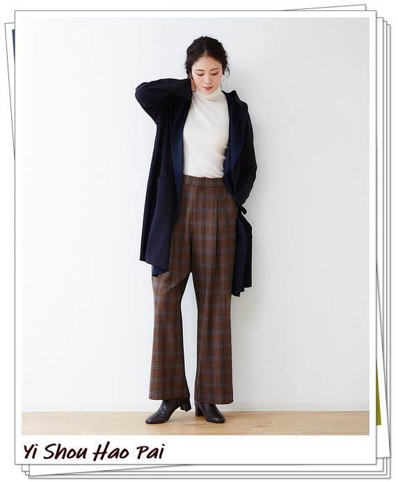 方头短靴,造型时尚,搭配格纹裤很好看。粗跟设计提升轻熟女人味。海军蓝的开衫也有知性气息。由于整体较暗沉,选择白色内搭提亮造型会很好。
