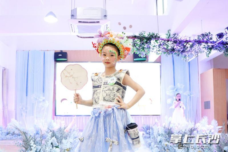 萌娃们的“环保时装秀”更是引起了大家的关注。活动现场,他们身着各式“环保时装”,上演了一场精彩的“创意环保秀”。废旧纸张经过精心折叠拼接,变成了优雅的裙摆,随着模特的步伐轻轻摇曳,仿佛在诉说着环保的故事;零碎的布料边角料重新组合,成了一件独具个性的套装,搭配上独特的配饰,展现出别样的时尚与个性;书法草稿、废纸和旧包装袋等材料,做成一条国风荷韵裙,莲花、莲叶体现“清廉正直”的优秀传统文化;用废旧垃圾袋和包装袋做成苗族服装,易拉罐做成银首饰和项圈,萌娃身着“传统苗族服饰”惊艳亮相……每一件作品都凝聚着“0号雷小锋”的智慧和对环保的热爱,赢得了一阵阵热烈的掌声。