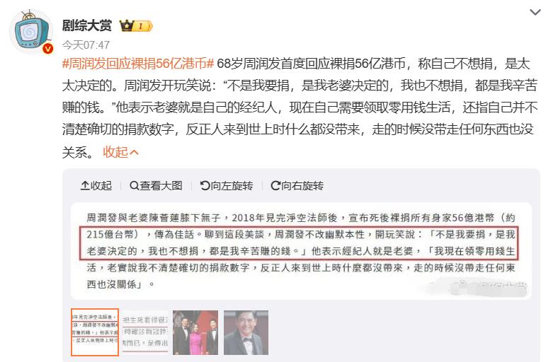 根据最新消息,近日,68岁的周润发首度回应了他裸捐56亿港币的行为。他表示,这不是他个人的意愿,而是由太太做出的决定。开玩笑地说道:“不是我要捐,是我老婆决定的,我也不想捐,都是我辛苦赚的钱。”他还透露,太太在家庭中充当经纪人的角色,管理家庭财务。尽管如此,周润发现在需要向太太领取零用钱以维持生活。