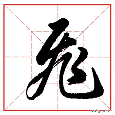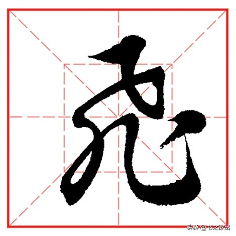 中竖以平切落笔,中锋下行,竖身稍细,劲挺有力,收笔略作钩势;左边点笔角度稍立,勿重,收笔牵丝引带撇画;撇画承接左点的收笔笔势,先竖后撇,注意行笔的轻重变化,过撇肚后再向左快速提锋撇出,力达撇尖;下面横折斜钩横画大抗肩,向右行笔略轻,到位后再向上稍提锋顿笔向右下弯行,行笔的角度与上面“飞钩”不同,舒展遒劲;最后两个点笔勿大勿重,布白均匀,首尾呼应。