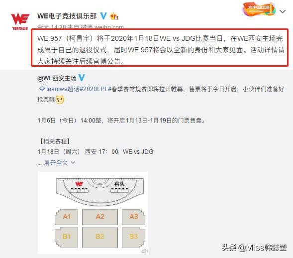 今天WE战队官宣上单选手957,将于1月18日WE与JDG比赛当日,在WE西安主场完成属于自己的退役仪式。