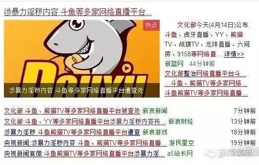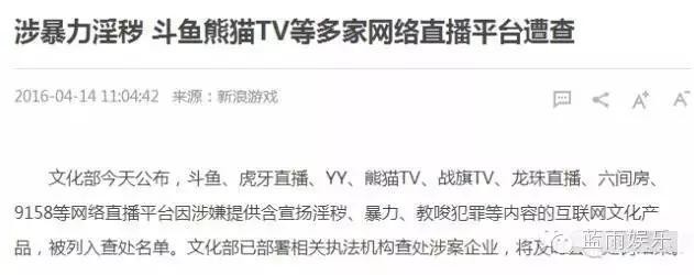 文化部发出一则重磅声明:YY、斗鱼、熊猫TV等多家网络直播平台涉嫌暴力淫秽内容传播,现已正式责令有关部门对涉案几家企业进行查处!