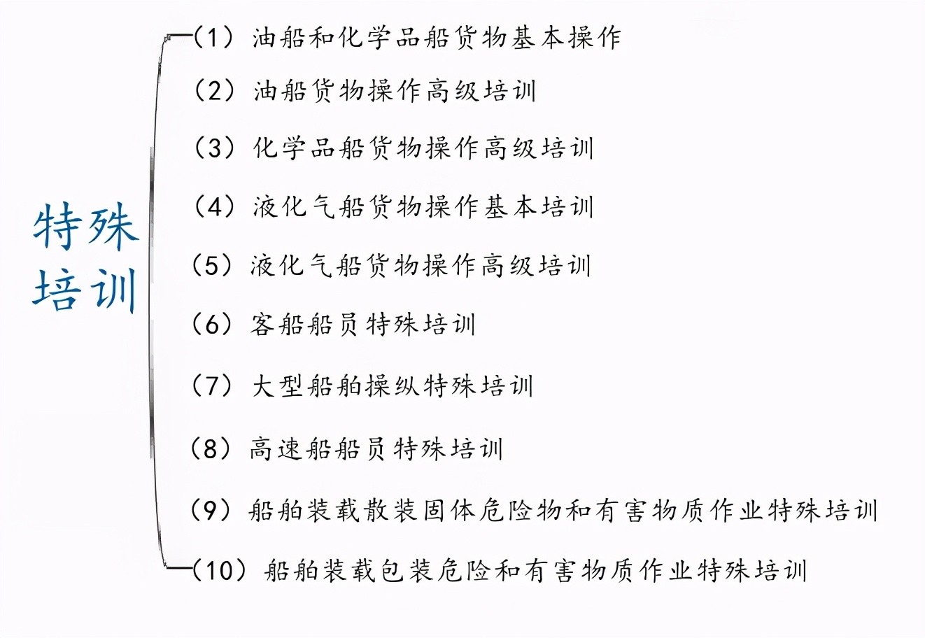 特殊培训,指针对在危险品船、客船、大型船舶等特殊船舶上工作的船员所进行的培训,包含的培训项目见下图: