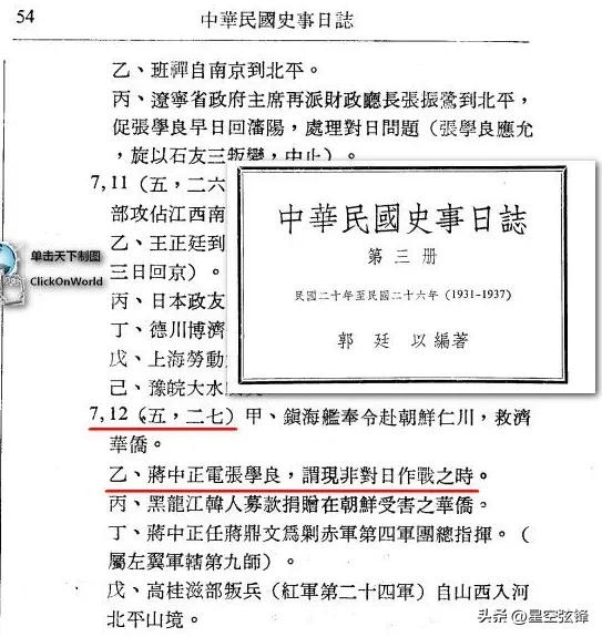 2,历史物证。注意看下图,这是已公布的中华民国史事日志的一部分内容,里面清楚的写到:“蒋中正電張學良,謂現非對日作戰之時”。