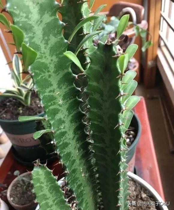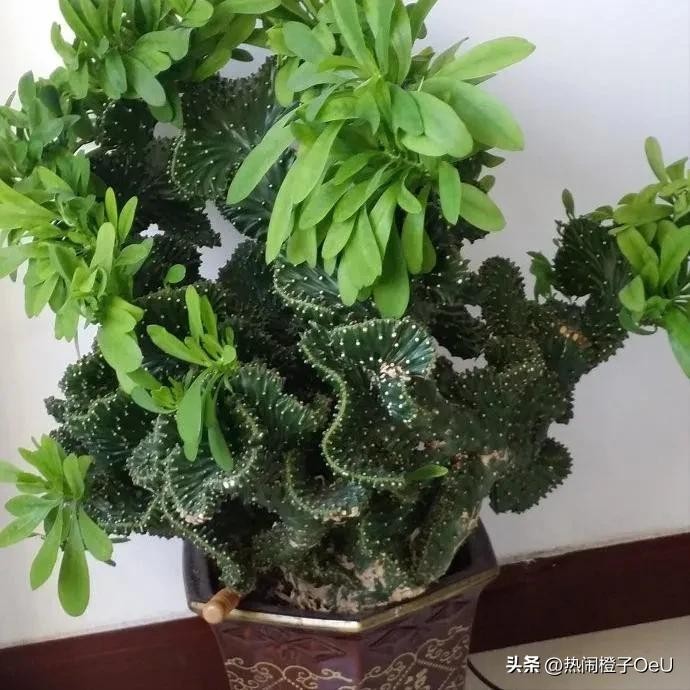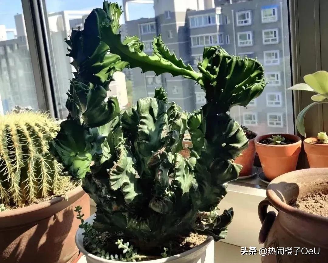 而在我们的日常生活场景里,金麒麟却以一种憨态可掬的多肉植物形象出现。它属于缀化的仙人掌,也被亲昵地叫做金麒麟花。瞧,这小家伙肉乎乎的,茎上布满了褐色的硬刺,像是给自己穿上了一层坚固的铠甲。叶子呈广披针形,一片挨着一片,错落有致地生长,宛如一把把绿色的小宝剑。