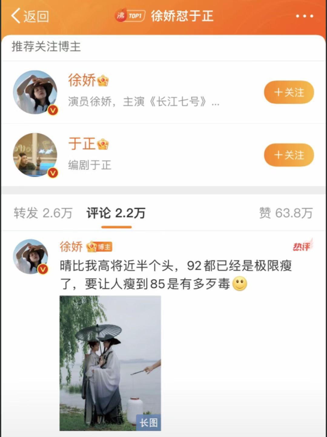 故事的开始,是于正发文表示自家艺人92斤太胖。