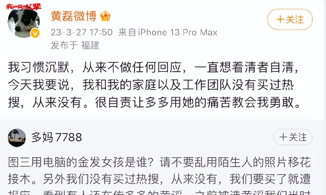 孙莉发文后,黄磊也在网上发声,称自己和团队从来没有买过热搜,从来没有,很自责让多多用她的痛苦教会了自己勇敢。