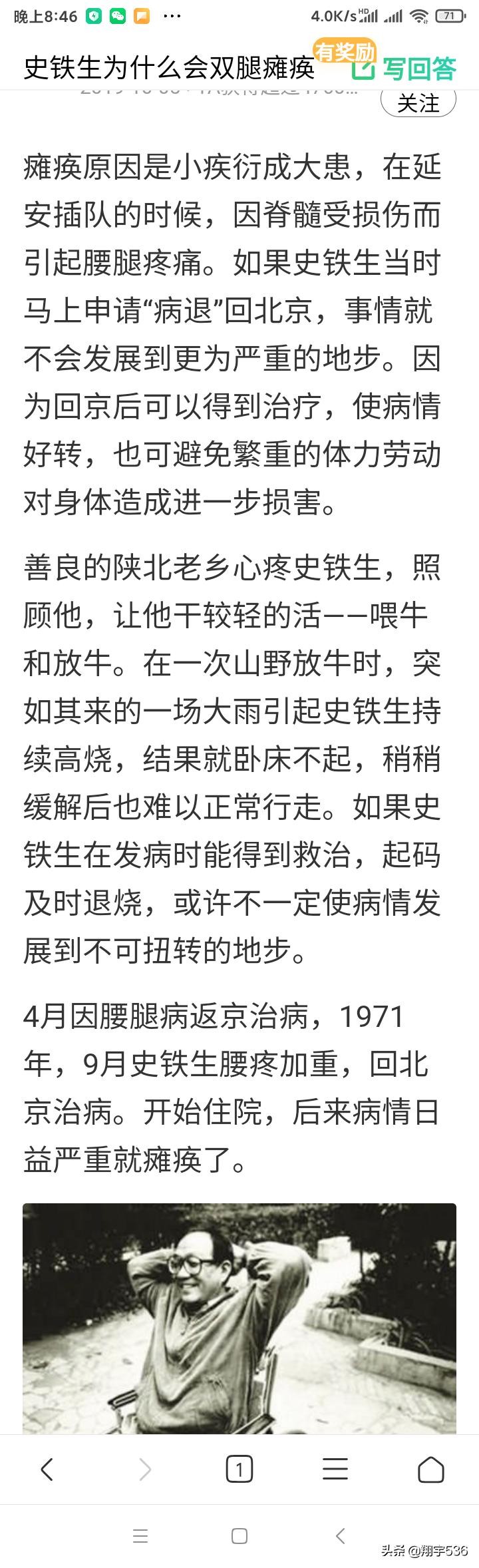 史铁生身残志坚的事迹想必朋友们知道的比我都多,不详细介绍了。造成他瘫痪的原因据说是当年插队的时候因病没有及时治好。后来加重了,虽经多方医治,然而终究回天乏力,导致后半生不得不在轮椅上度过。好多的资料里也是这么说的。