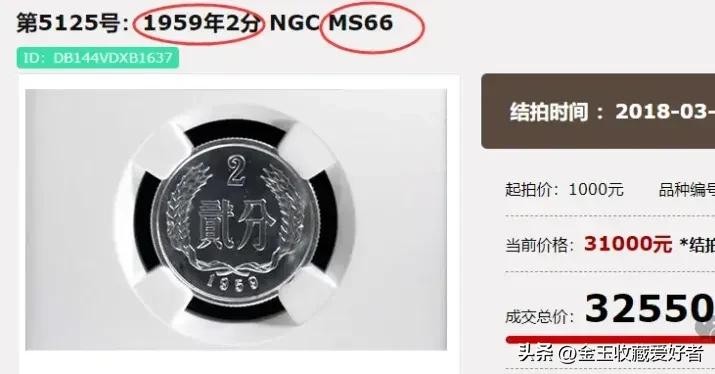 在一场钱币拍卖会中,评级66分的59年02分,拍出了32000元的高价。原因就是如此高评级的硬币存世量不超过五枚。有的朋友或许问这种品相的二分硬币,我们普通收藏号者手里是不可能有的。尽管如此,流通品相的59年二分它的市场价格也是非常高的。