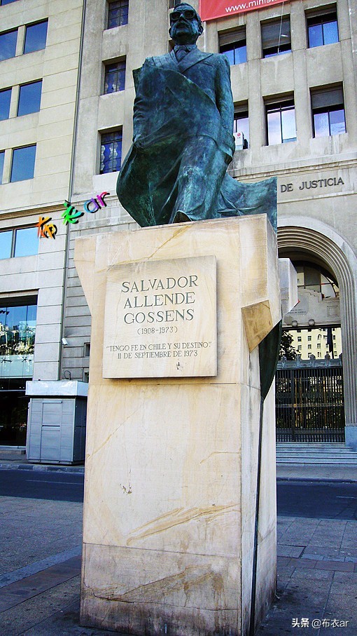 智利民选总统萨尔瓦多·阿连德(Salvador Allende)塑像。在总统府北门外的宪法广场有一塑像,是被军政府推翻的民选总统阿连德。