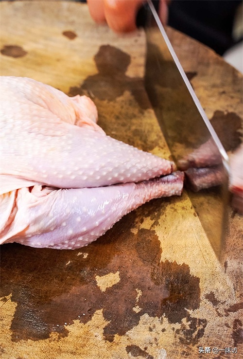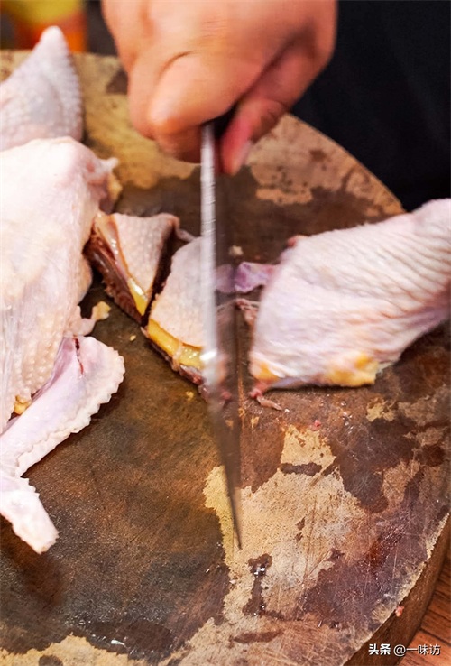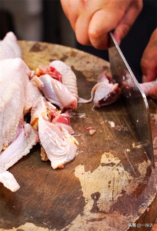 鸡洗净后然后沿着关节的地方切成大小均匀的块,整鸡在食材中比较不方便处理,切块时就需要用到一些小技巧。买回家以后的鸡肉,我们要先从鸡头开始进行处理,准备一把很锋利的菜刀,然后用力将鸡头一刀砍下。在砍鸡头的时候,要连同鸡脖子一并砍下来。