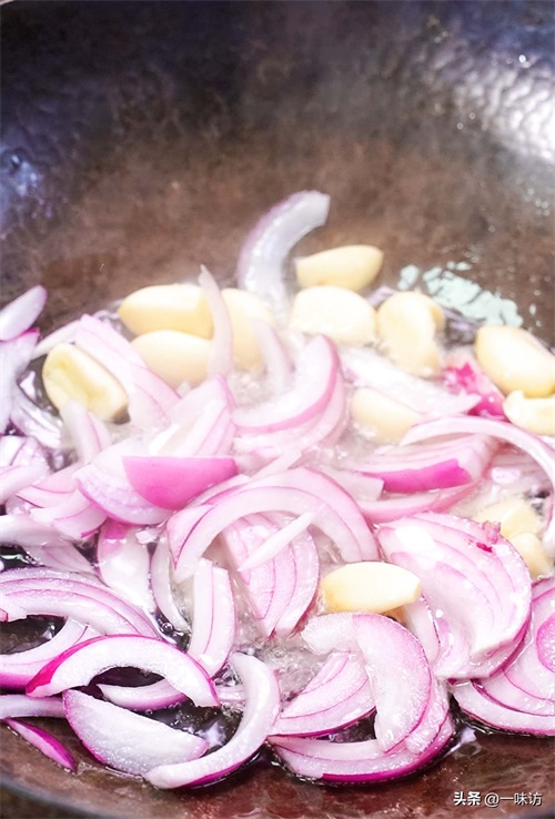 取一口砂锅,冷锅在锅底加入少许底油,然后开火加入刚才准备好的洋葱丝和蒜瓣一起翻炒出香味。