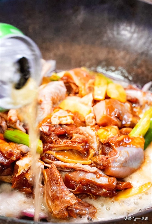翻炒出香味后倒入腌制好的鸡块,然后倒入啤酒,啤酒可以用精粮啤酒最佳,麦芽度高更香。