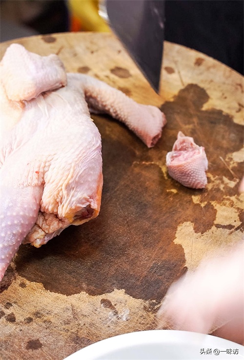 最后剩下的鸡头,我们要先检查一下是否有残毛处理鸡身的时候,要先把鸡脚给剁掉,在剁的时候,记得从鸡脚正中间关节部位去剁,只需轻轻一刀,就能把鸡脚给剁断。