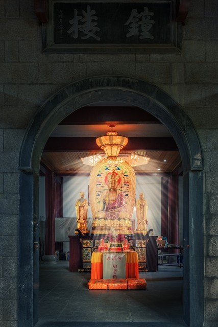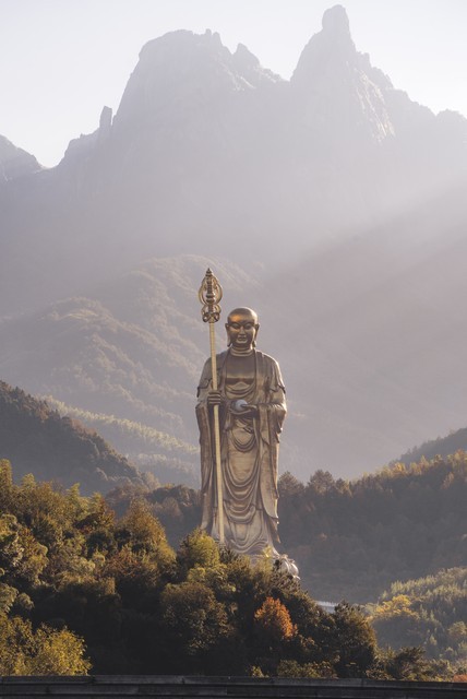 地藏王菩萨的众多化身中,最有名的可能是金乔觉。据说,唐玄宗时期,新罗国有一位出家人,名叫金乔觉,他孤身一人带着他的白狗善听,渡海来到大唐求法。他们从青岛登陆,几经磨难,辗转到江南一带,并于开元七年(719)来到九华山下,见青峦叠嶂连绵百里,云雾缭绕,清凉宜人,便安住了下来。据说当时九华山还叫“九子山”,山主是闵公,金乔觉向闵公化缘一块地建立道场。