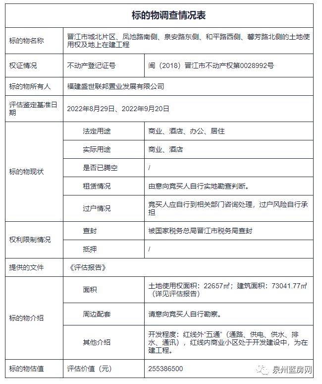 根据阿里资产消息,标的物位于晋江市城北片区、凤池路南侧、泉安路东侧、和平路西侧、馨芳路北侧的土地使用权及地上在建工程,用途商业、酒店,土地使用权面积22657㎡,建筑面积约73041.77㎡,评估价值255386500元,起拍价255386500元。