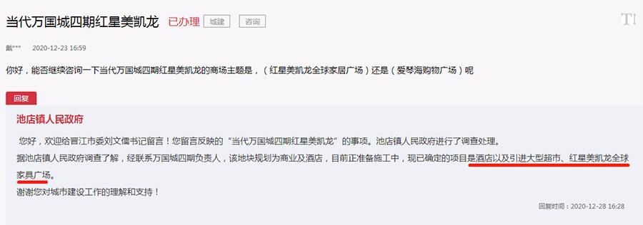 据此前官方回复信息显示,当代万国城四期地块规划为商业及酒店,拟引入酒店及大型超市、红星美凯龙全球家具广场。