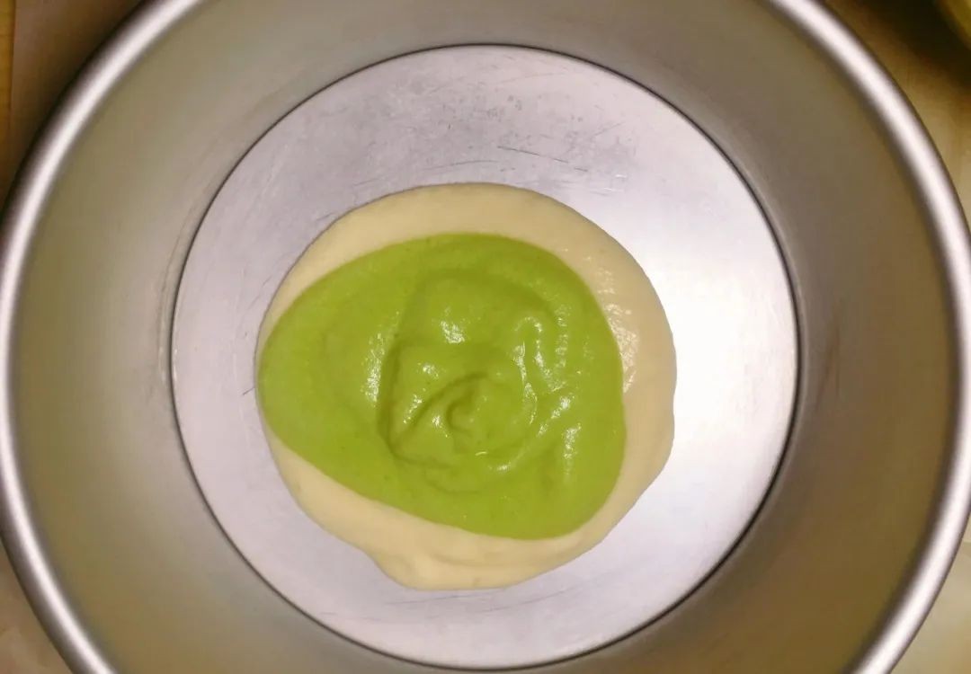 11、再挖一勺菠菜蛋糕糊,放在酸奶蛋糕糊上,轻震一下
