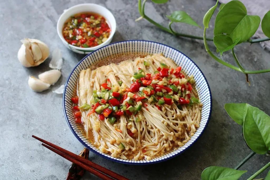 用料:金针菇400克、青椒1个、红椒2个、蒜米40克、生抽20克、蚝油20克、玉米油30克