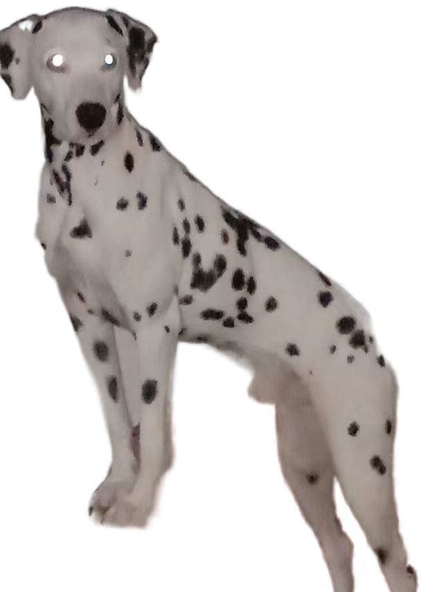 斑点狗的体型通常较大,身高约为 50-60 厘米,体重约为 20-30 公斤。它们的毛色通常为白色或浅色,身上有黑色或棕色的斑点,非常醒目。斑点狗的毛色和斑点图案因品种而异,有些品种的斑点比较大,而有些则比较小。