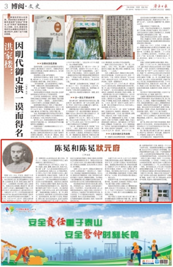 陈冕(1859-1893),字冠生,清咸丰九年(1859年)出生在济南鞭指巷北首路西的陈家大院。他出身官宦之家,祖父陈显彝曾任山东盐运使,山东候补道,登、莱、青州兵备道,诰封“资政大夫”。父亲陈恩寿,历任莱阳、恩县、长清县县令。陈冕自幼天资聪颖,勤奋好学,博习经史,从师于山东举人、翰林院编修王芷庭,14岁便考中秀才,成为我国历史上最年轻的秀才之一。光绪元年(1875年),16岁的陈冕在顺天府参加乡试中举,他应试的文章写得很好,因而声名大噪。但在来年的京城会试中却落第了。光绪三年、六年(1877年、1880年),陈冕又两次参加会试,皆因年龄太小而未中。光绪九年(1883年),他第四次入礼部贡院会试,榜上有名。四月二十一日殿试,24岁的陈冕高中状元,成为我国历史上最年轻的状元之一。