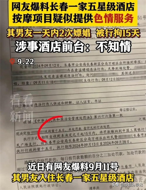 吉林长春一家五星级酒店被曝提供非法服务,男友因此被拘留15天!
