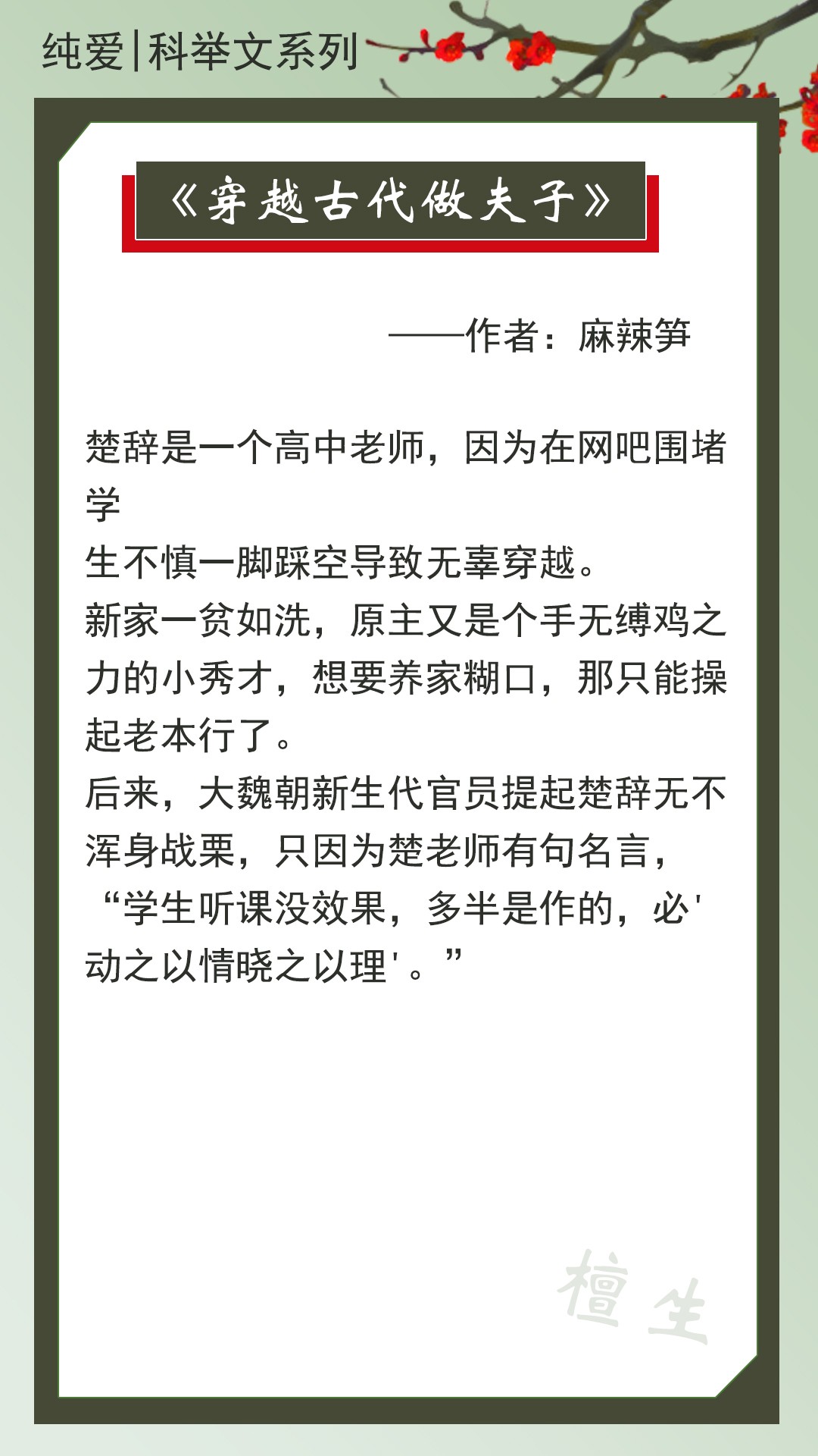 第一本:《穿越古代做夫子》作者:麻辣笋