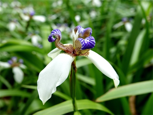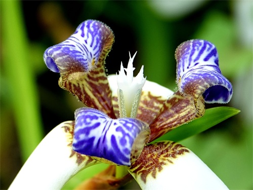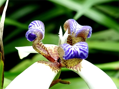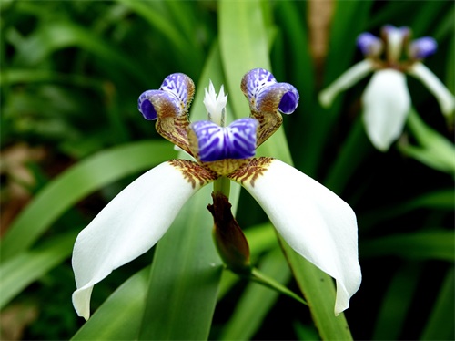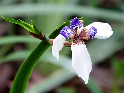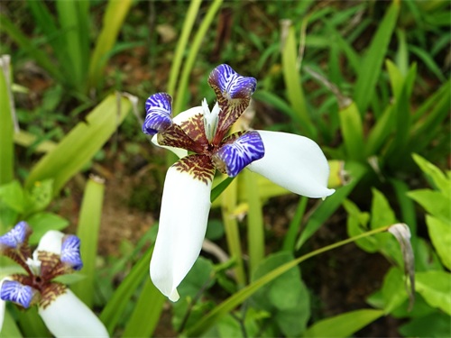 2019年5月初,我到华南植物园游览,在北门外边我看到了一种没有见过的鸢尾,它的花虽然也是上3片下3片的6瓣,但颜色和形态都与鸢尾不同,鸢尾的花瓣都是紫色的,下面的三片下翻,上面的三片上挺;而我新看到的下面的三片虽然也下翻,但颜色是白色的,基部有少许棕色花纹,上面三片上挺且向外翻卷,下边直挺部分有棕色花纹,上边外卷部分有紫色花纹。