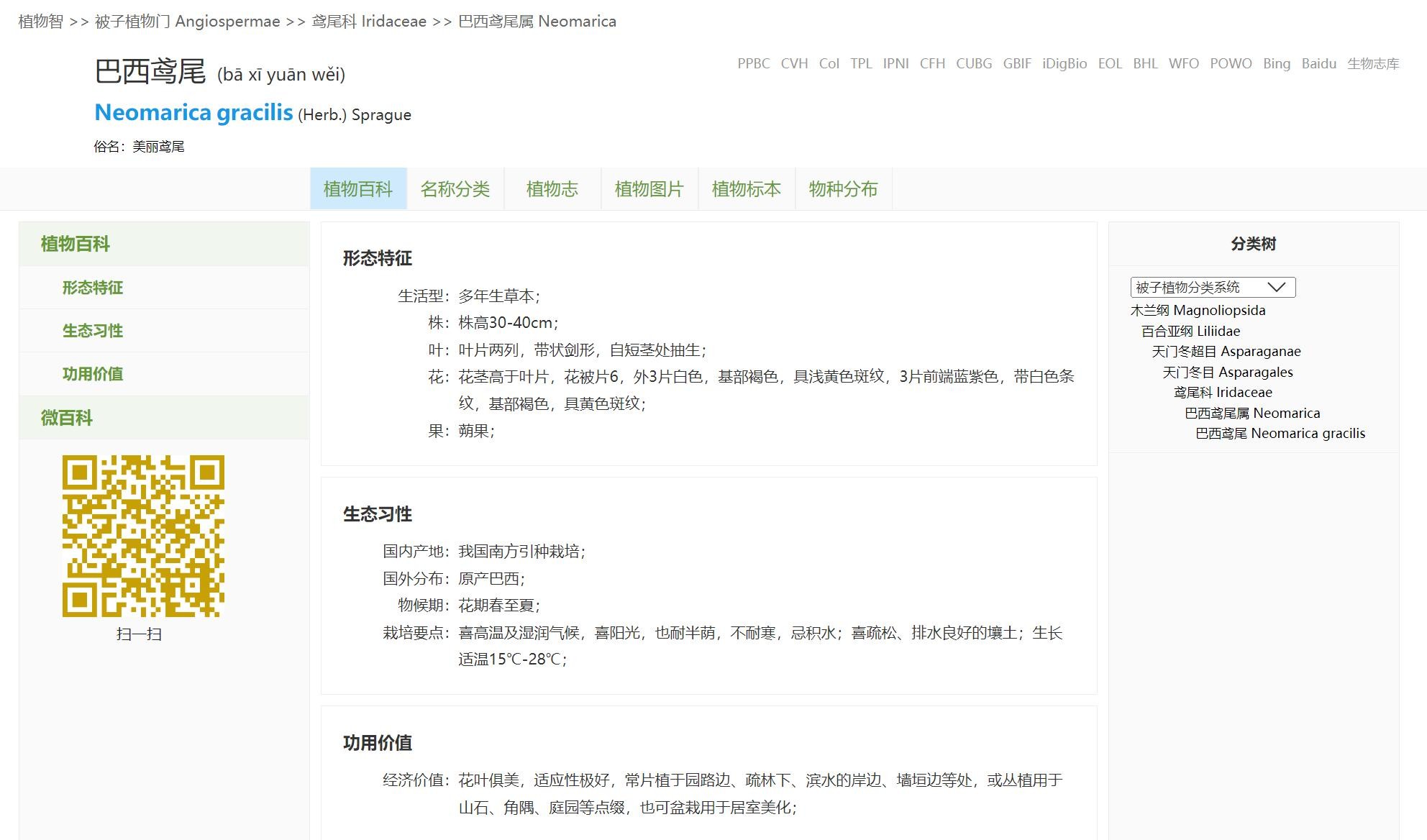 《中国植物志》没有收载本植物,植物智有相关介绍,说它俗名为美丽鸢尾,是多年生草本。原产巴西,我国南方引种栽培。它花叶俱美,适应性极好,常片植于园路边、疏林下、滨水的岸边、墙垣边,或丛植于山石、角隅、庭园等处作点缀,也可盆栽用于居室美化。