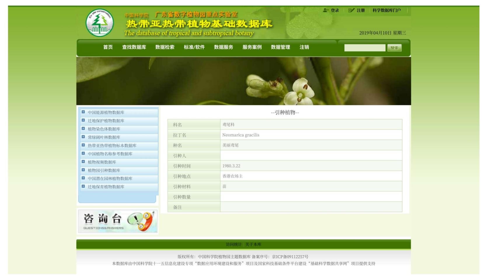 关于引入中国的时间,中国科学院广东省数字植物园重点实验室热带亚热带植物基础数据库2019年4月10日发布的“引种植物”信息显示:美丽鸢尾Neomarica gracilis,引种时间为1980年3月22日,引种地点为香港农场,引种材料为苗。可知中国最迟于1980年3月已引入了巴西鸢尾。