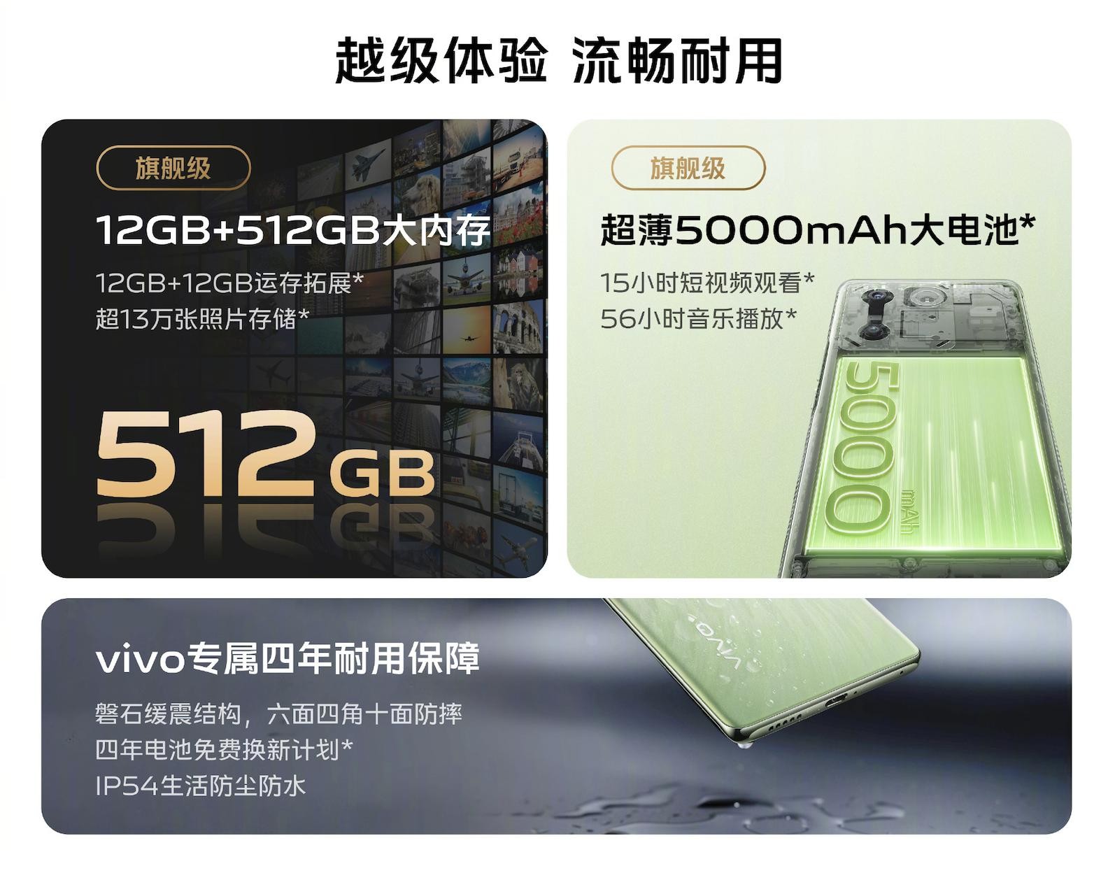 内存储存方面可选12+512大内存,12GB+12GB的大运存、超薄5000mAh大电池再加上可靠的品质,用户能放心更长时间的使用。总体上vivo Y100有着高颜值、好影像、好体验的优点,无疑是Y系列新一代的“越级新标杆”。