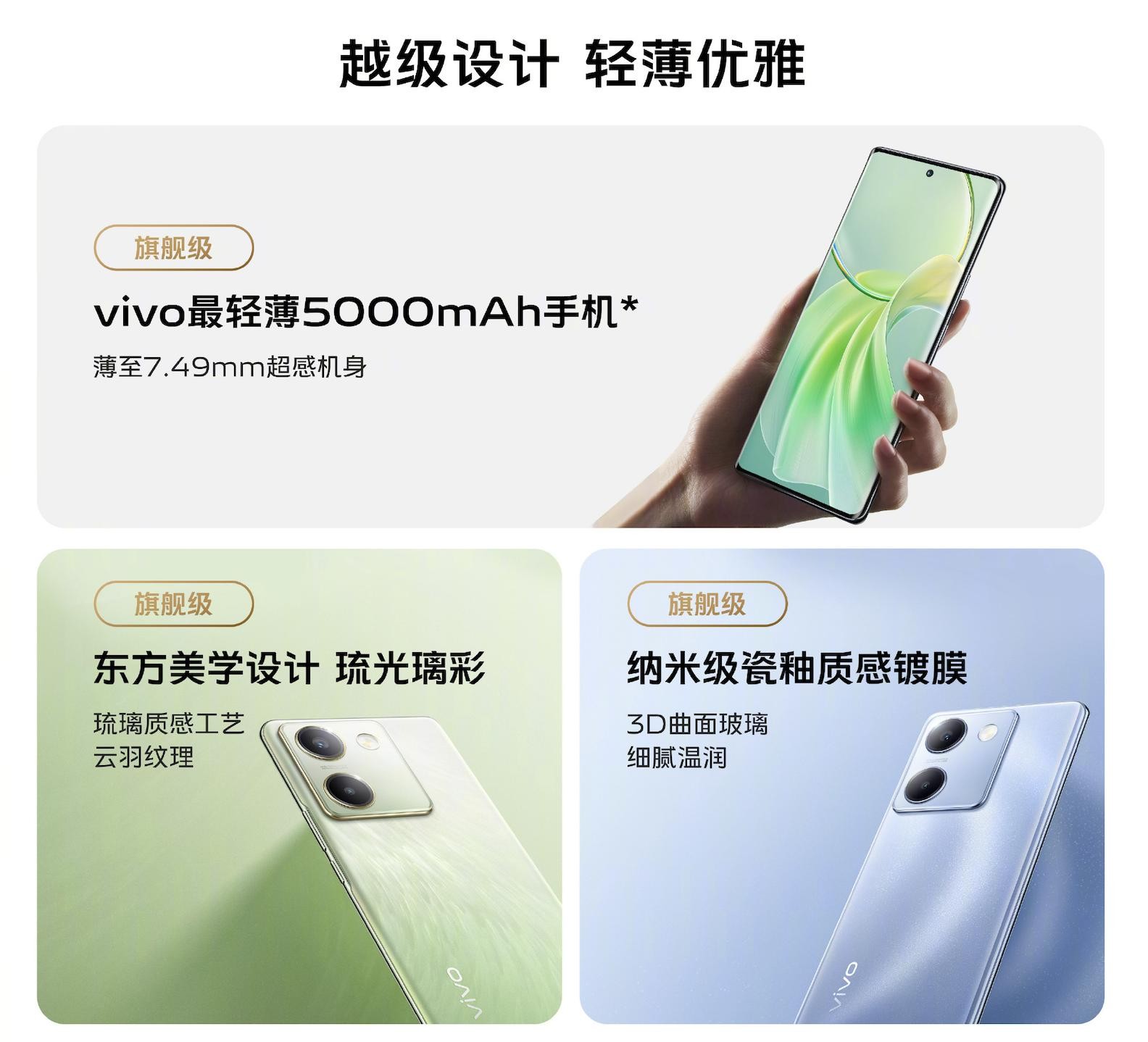 首先在vivo Y100的外观设计上我们能看到它带着旗舰级别的高质感,机身后盖是3D双曲面玻璃的设计拥有温润的手感,并采用了东方美学琉璃工艺,在玻璃后盖上赋予了琉璃质感,新机三个配色分别为,琉云青、璃光蓝和星夜黑。屏幕为6.78英寸的3D OLED曲面屏,旗舰级别的视觉享受。