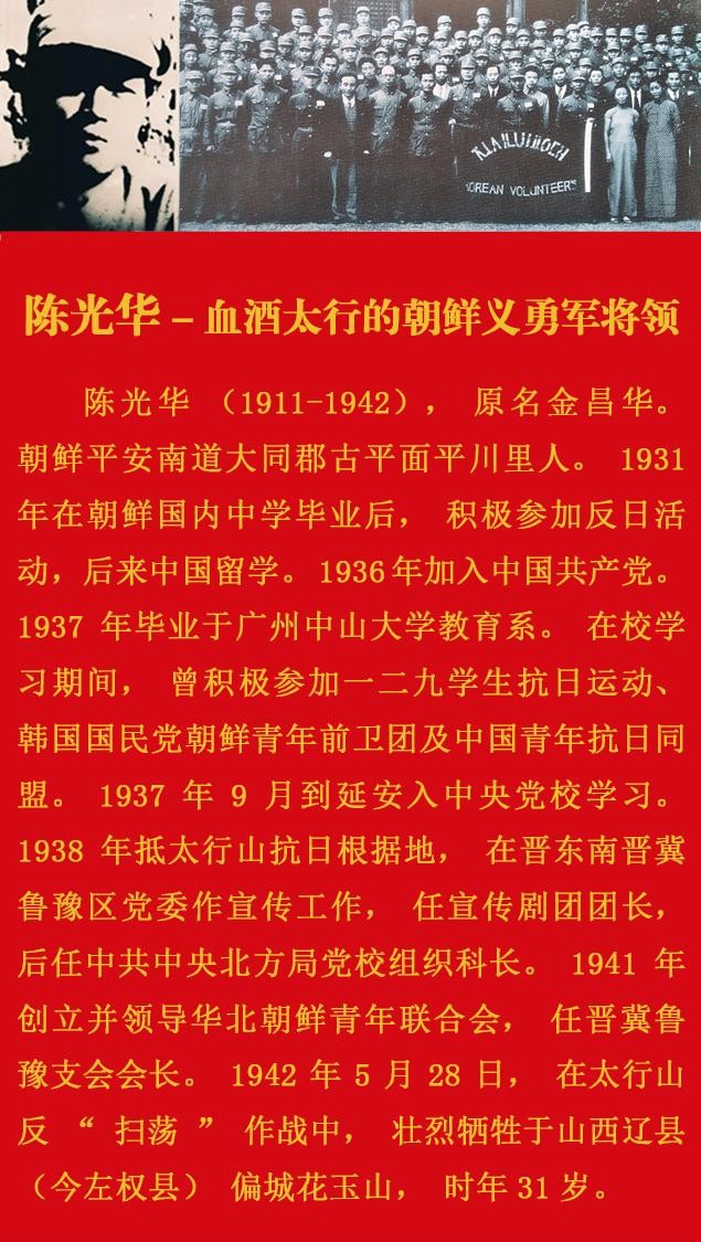 陈光华(1911-1942),原名金昌华。朝鲜平安南道大同郡古平面平川里人。1942年5月28日,在太行山反“扫荡”中,壮烈牺牲于山西辽县(今左权县)偏城花玉山,时年31岁。纪念地为邯郸涉县石门村,晋冀鲁豫抗日殉国烈士公墓,是我国第一座安葬中韩抗日烈士的墓园。近年在陈光华、石正墓附近修建了朝鲜义勇军纪念馆。