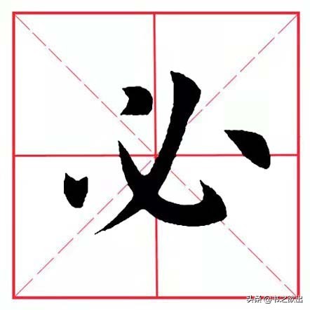 首笔撇画起笔稍高,斜切落笔后即向左下行,注意行笔的角度以及轻重变化,出锋勿长,要力达撇尖,不可一笔甩出;卧钩起笔略低,弯度稍大,露锋入笔后顺势向右下行,边行笔的同时边缓慢加重,过撇笔后行笔稍平、稍弯,随即向左上方挑笔出钩,内圆外方;上部点笔顺着出钩的方向落笔,比撇笔略低,落笔后即向左下引毫收笔,出锋意带下一笔画;左点略低,注意与右边的距离,不要写散,出锋指向下一笔画;最后右点落笔顺着左点的收笔方向,略高于卧钩的起笔,形体饱满,三角一肚,注意角度。