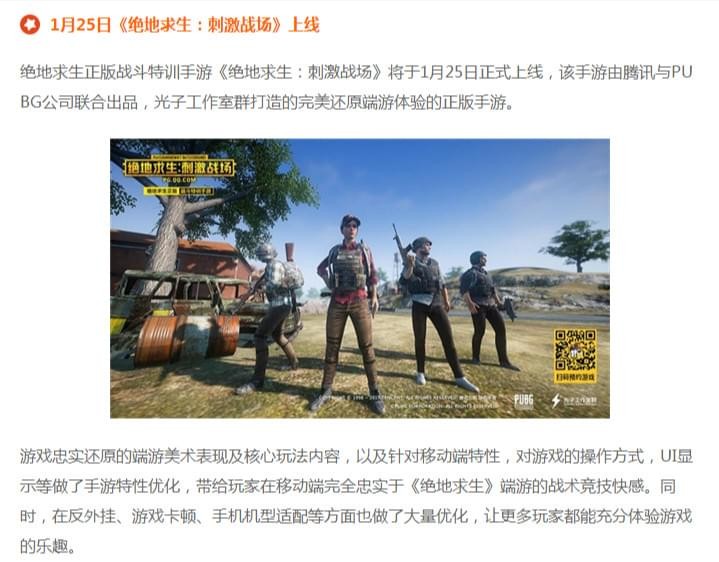 腾讯吃鸡手游《绝地求生:刺激战场》1月25日上线 官网可预约
