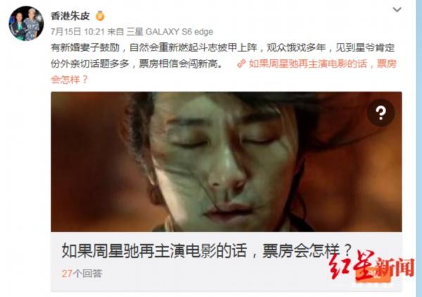 7月15日,“香港朱皮”在微博称:“星爷有新婚妻子鼓励,自然会重新燃起斗志披甲上阵。”从而网络传出了周星驰已经注册结婚的言论。