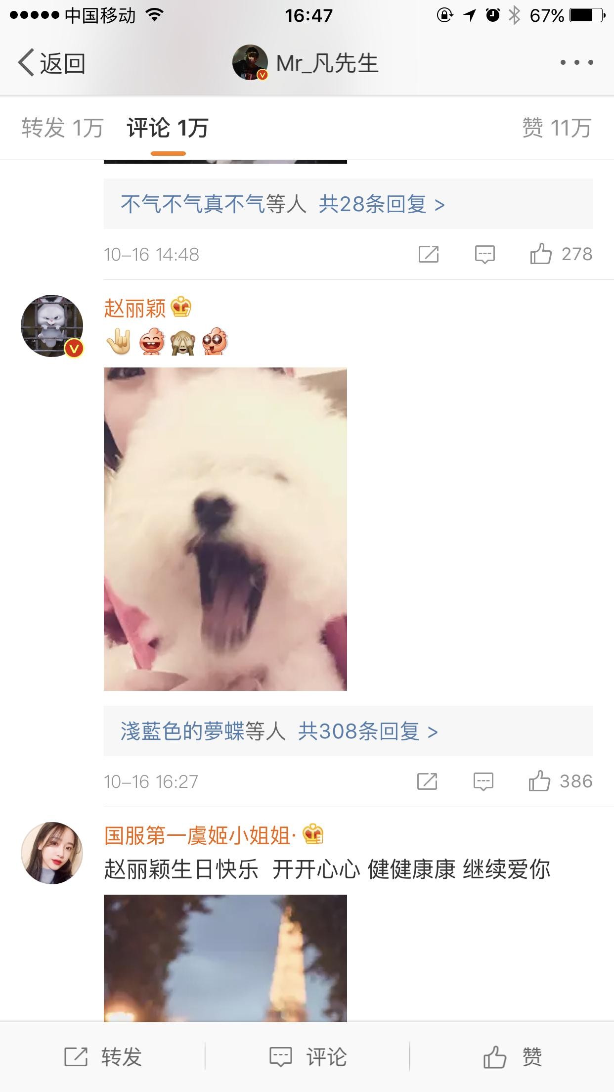 而赵丽颖对一众艺人朋友的生日祝福,基本统一用两三个表情符号回复,而回复吴亦凡竟然带上了自拍,并且抱着最爱的毛球。可以说是特例了。