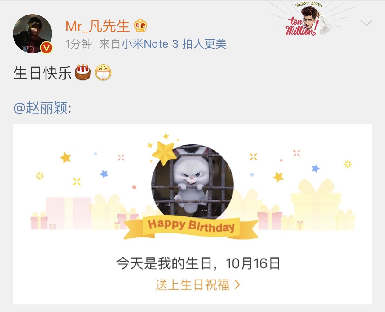 了解吴亦凡的人都知道,她很少用微博给艺人送祝福,尤其是女星,还是当红花旦,之前只有给范冰冰祝福过。并且他用的是转发。