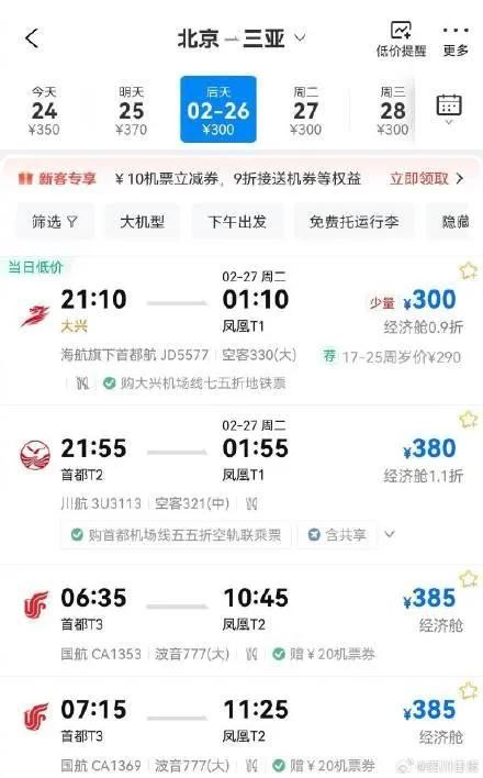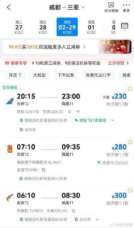 2月24日,记者通过某出行平台搜索发现,元宵节后,成都飞三亚的机票确实已经低至1折。以2月27日成都飞三亚为例,最低价格为230元。算上机建和燃油费,只需300多元。而在另一出行平台上,国内部分地方已出现百元机票:成都飞昆明168元,成都飞南宁174元,北京飞哈尔滨186元,北京飞重庆190元等。