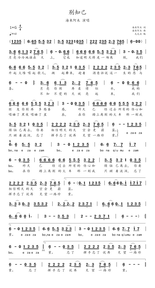 《别知己》是由海来阿木、阿呷拉古、曲比阿且演唱的一首歌,由海来阿木填词谱曲,曲比阿且编曲,歌曲发行于2019年3月5日,并收藏在专辑《别知己》中。 今年中秋晚会,金晨、海来阿木共同演唱该歌曲。