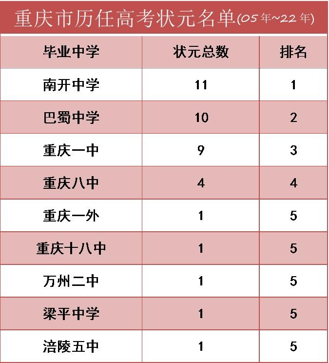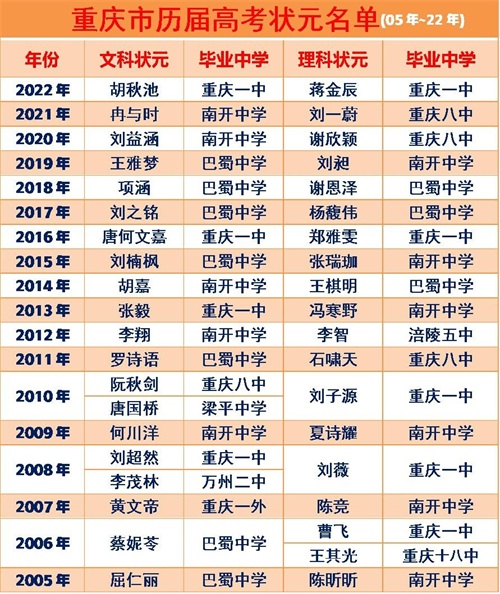 2005-2022重庆高考状元排行榜,南开巴蜀一中获前三甲