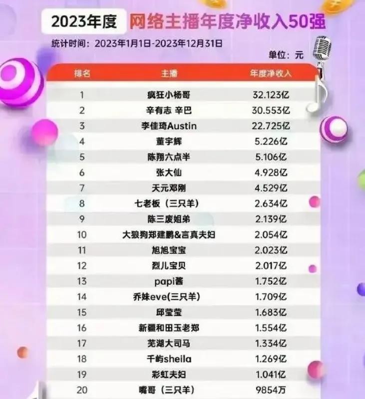 直播圈的吸金能力可不一般,主播行业是当下最火的行业之一,那么他们的年收入数据是多少呢?我们来看一下他们2023年的收入排名,肯定让你意想不到