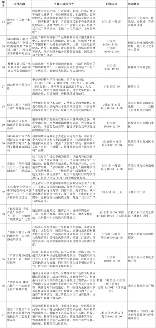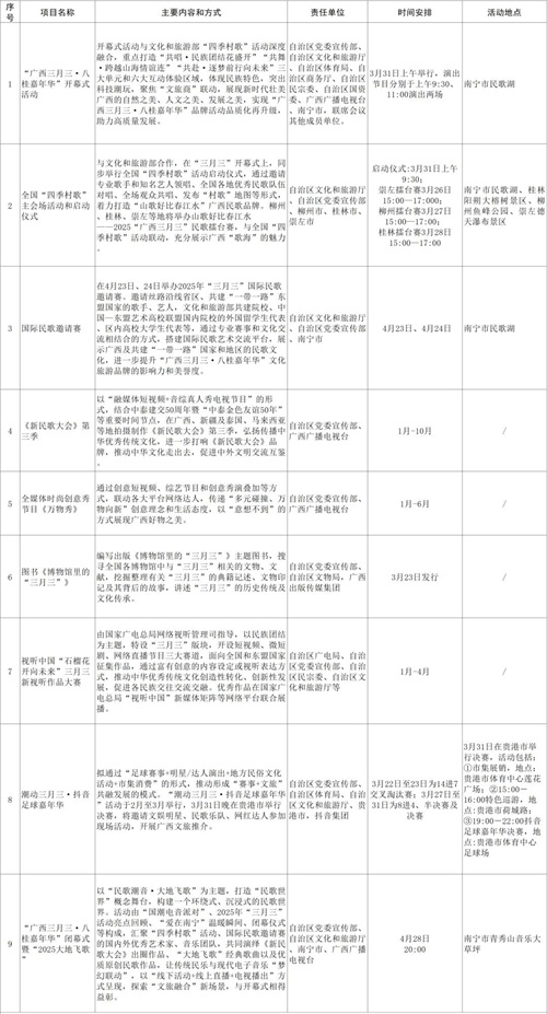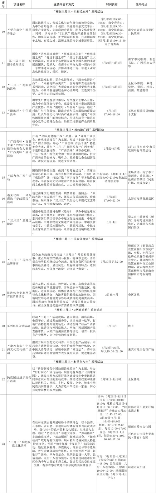 2025年“广西三月三·八桂嘉年华”文化旅游品牌活动将于3月31日上午在南宁市民歌湖举行开幕式,集中活动时间为3月31日至4月28日。自治区层面将开展9项重点活动和“多彩民族风”“相约游广西”“民族体育炫”“e网喜乐购”“和谐在八桂”五大版块共14个大类特色活动。与此同时,14个设区市也将结合地域特色、文化亮点,策划开展“三月三”系列活动。