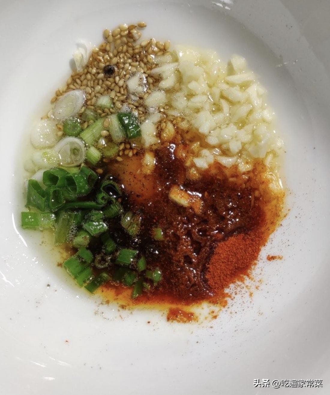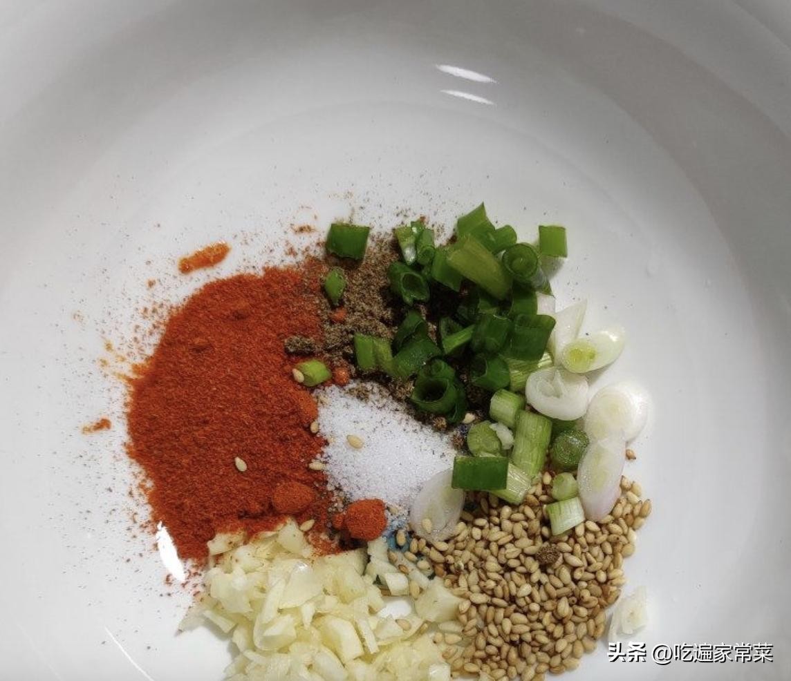 取一个碗,碗里放入蒜末,葱白碎,白芝麻,辣椒面,盐。