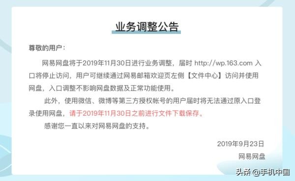 11月29日,网易网盘对外发布公布,宣布从2019年11月30日起网易网盘//wa.163.com入口将停止访问。用户需要从网易邮箱欢迎页面左侧【文件中心】访问并使用网盘。此外,使用微信、微博等第三方授权账号的用户届时将无法通过原入口登录使用网盘。并且建议用户于2019年11月30日前将网盘内文件转存到其他地方。