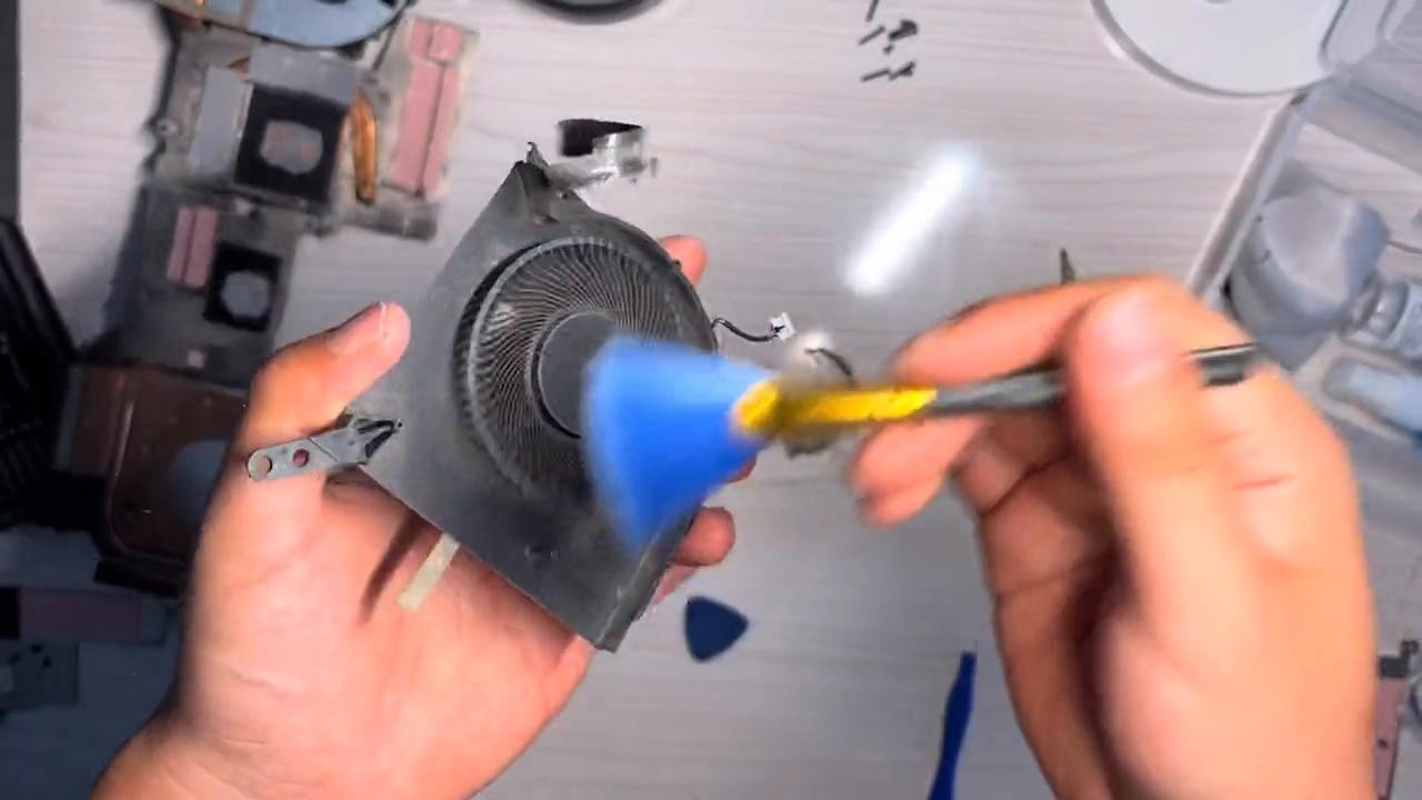 4. 然后拧开风扇螺丝,取下冷却系统。现在拿下冷却系统,拆下风扇螺丝。