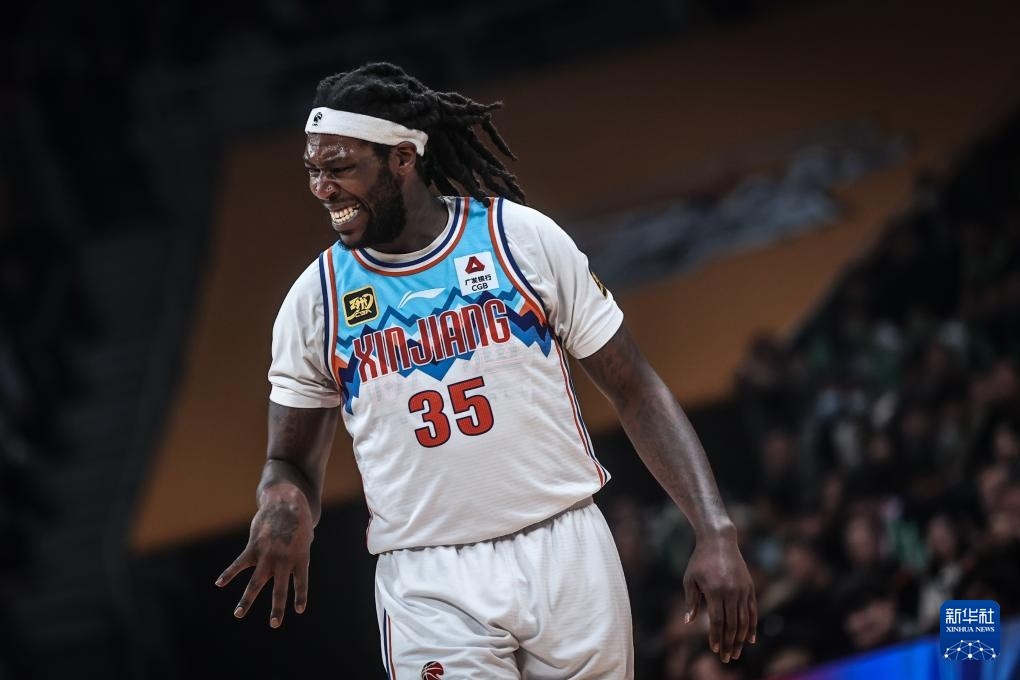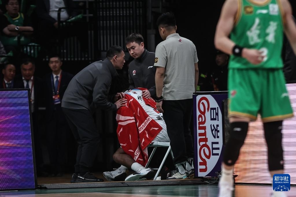 4月13日,新疆伊力特队球员哈雷尔在比赛中手部不适。